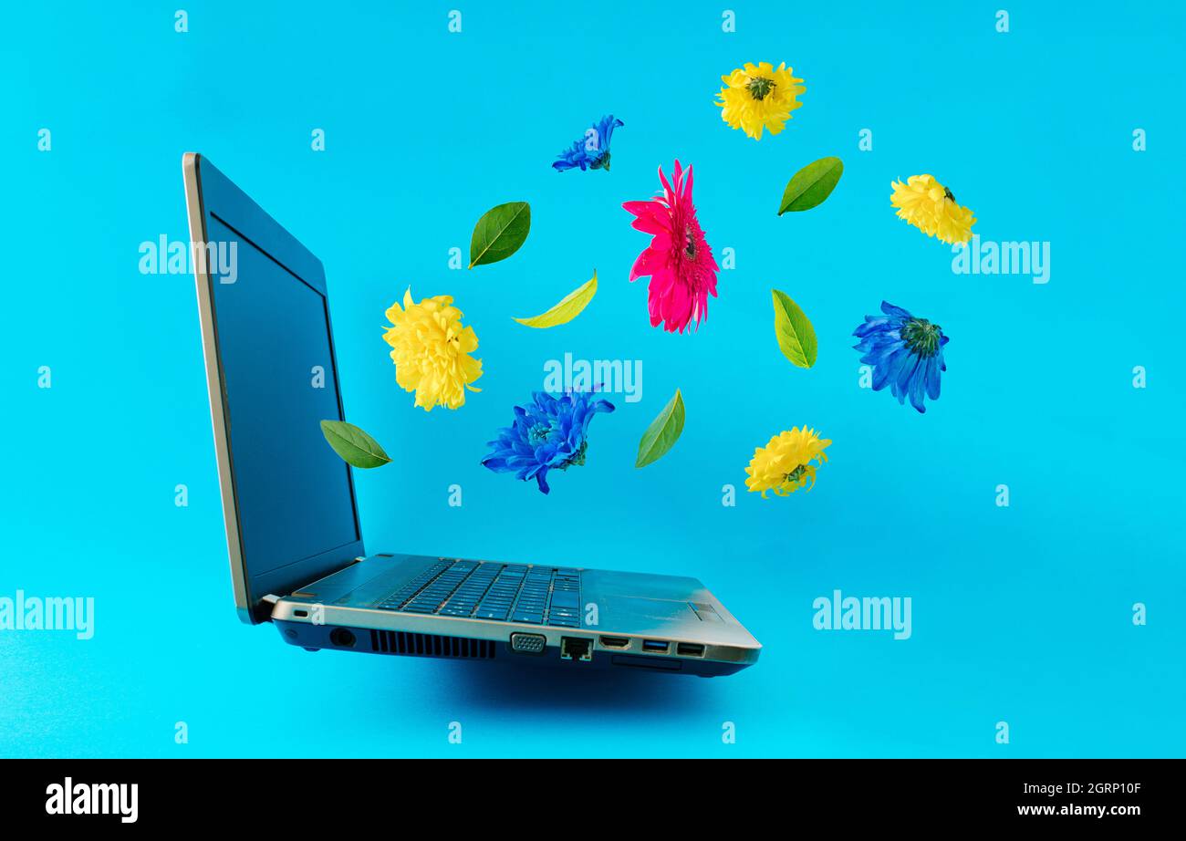 Laptop Isolated With Flowers On A Blue Background Promising Message And Cheerful News Announcement Concept Positive Thinking And Encouraging Energy Stock Photo Alamy