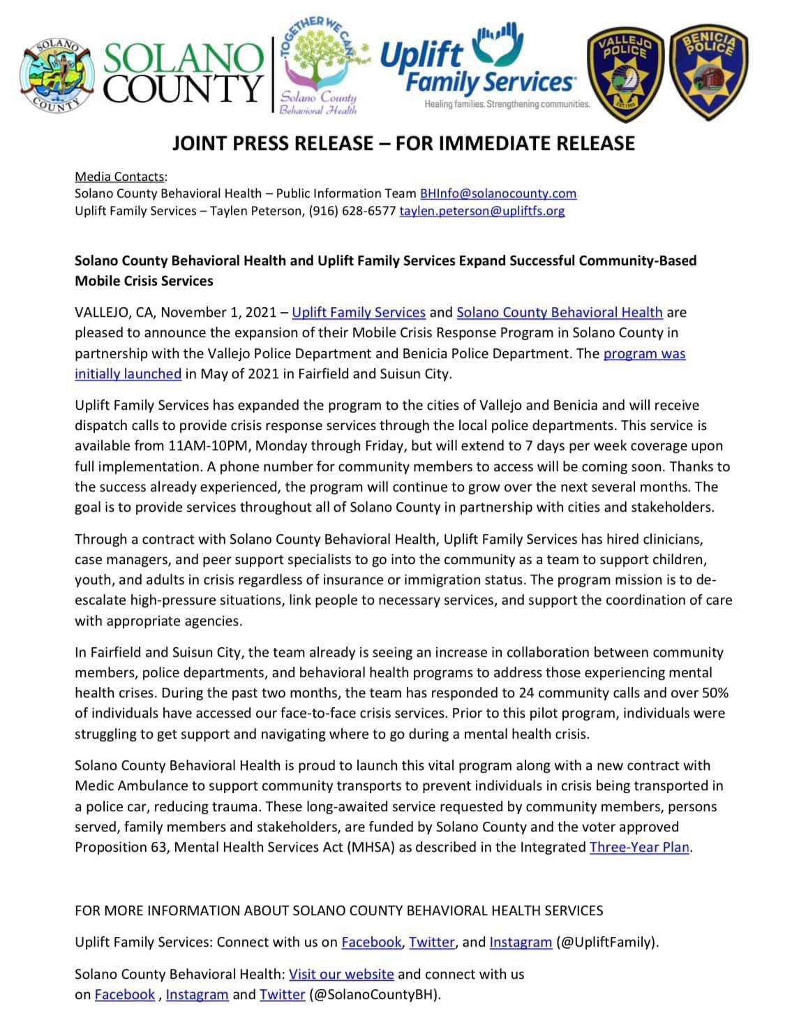 Vallejo Police Department On Twitter Solano County Behavioral Health And Uplift Family Services Expand Successful Community Based Mobile Crisis Services Https T Co Ge3vpjk816 Https T Co No3wnbzout Twitter